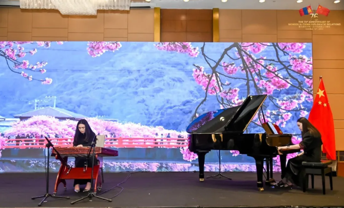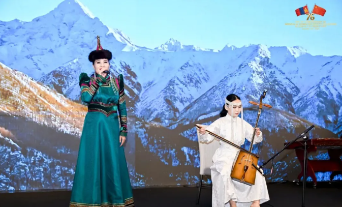 招待会现场洋溢着浓厚的文化交融氛围,中蒙两国特色文化演出精彩呈现。悠扬的旋律与灵动的舞姿,既是两国文化魅力的生动展现,更是民心相通的温暖见证,恰如“友谊的彩虹” 专场演出般,以艺术为桥拉近彼此距离。
